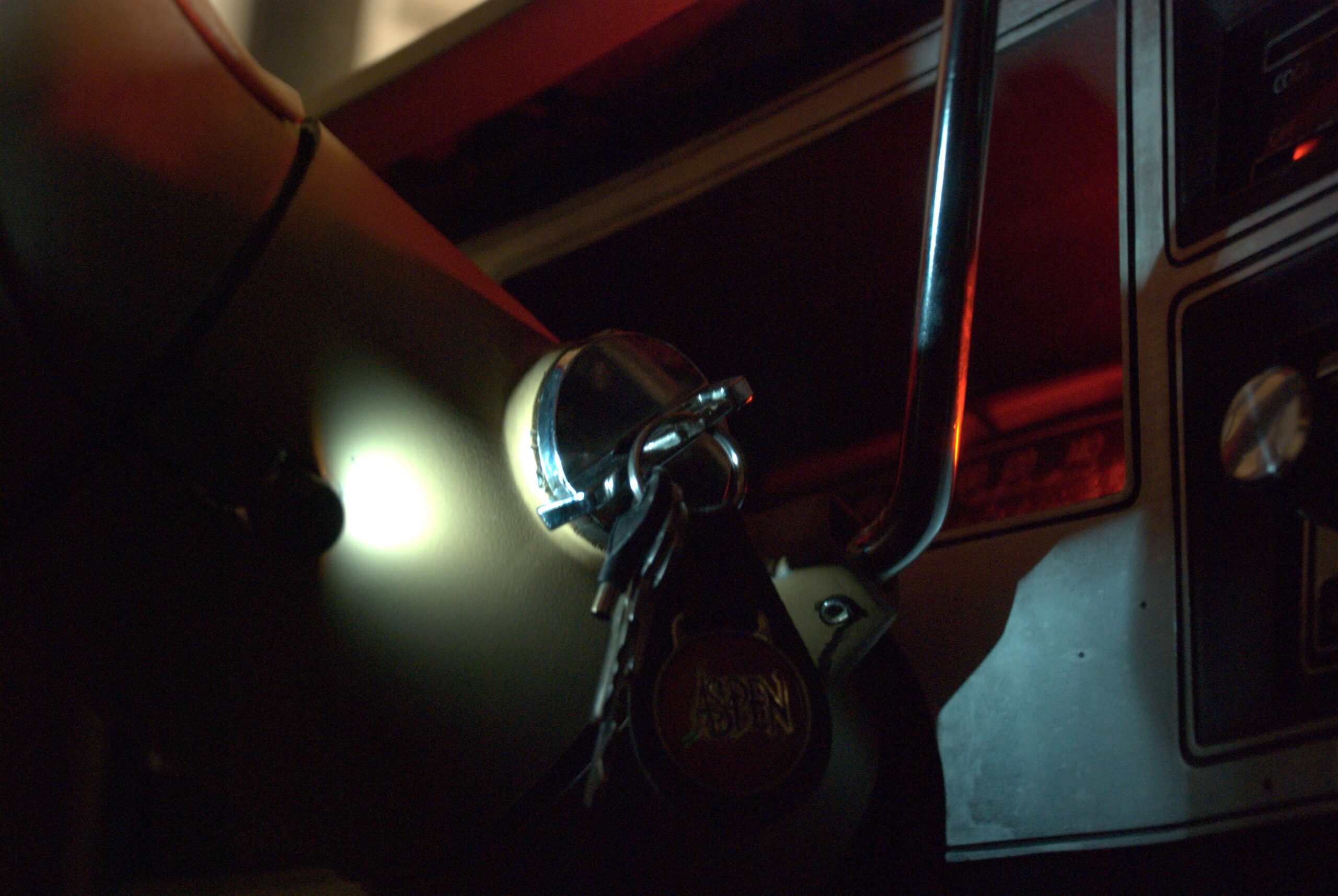 Kun ilmaisin eriävän mielipiteeni ääneen, totesi korjaamon edustaja, että vaikka sulkemisaika on jo mennyt, niin otetaan auto uudestaan sisään ja katsotaan yhdessä. Kun ajoin Aspenin takaisin sisään, puistelivat firman muut edustajat happamana päätään: Ei siellä mitään lampunpaikkaa ole. Kojelauta auki ja kello irti ja siinähän se oli. Kellon takana oli kaksi teipinpalalla peitettyä aukkoa: kalibrointiruuvi sekä korkealla huulloksella varustettu lampun läpivienti. Lampunmentävän aukon teippi vieläpä höplötti, kun olin irrottanut sen puoliksi kokeillessani lediä. Asennus tehtiin uusiksi kovalla kiireellä ja kaikki näytti toimivan, kuten todella ärsyttävästi ärisevä valosummeri. Vain alkuperäinen Hondurasissa (!) valmistettu viiverele ei ottanut viipyilläkseen.